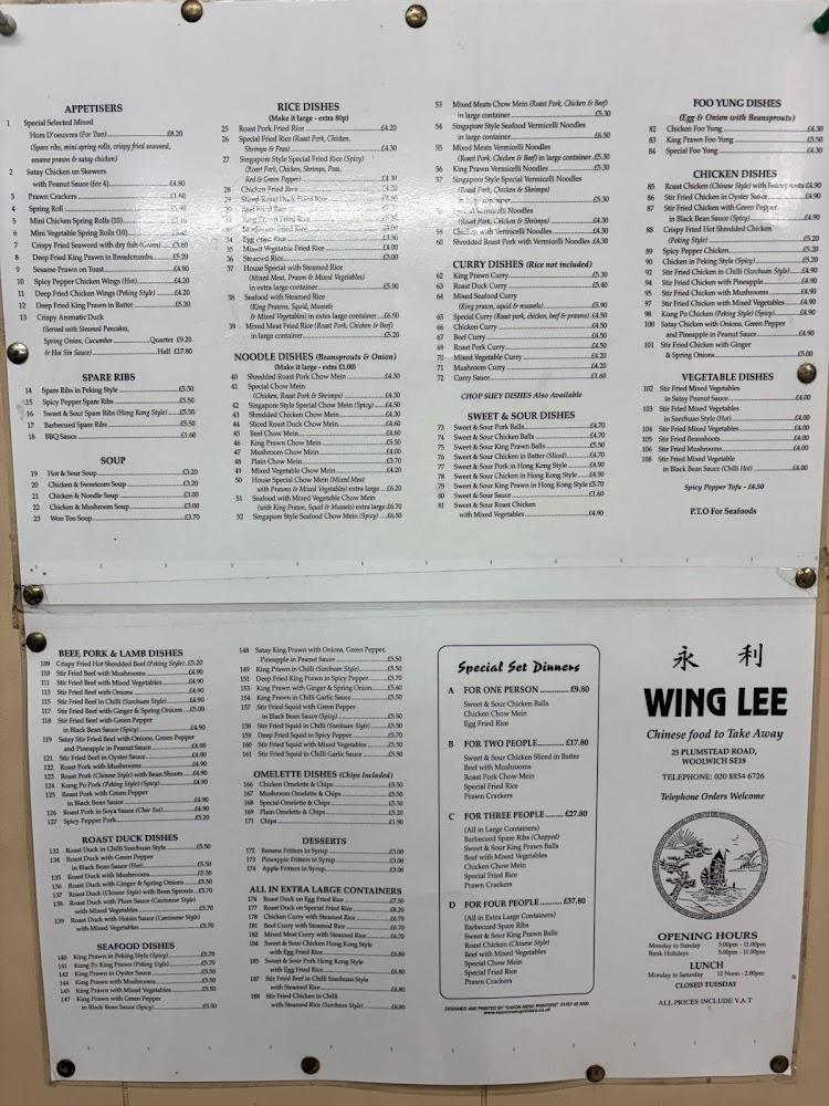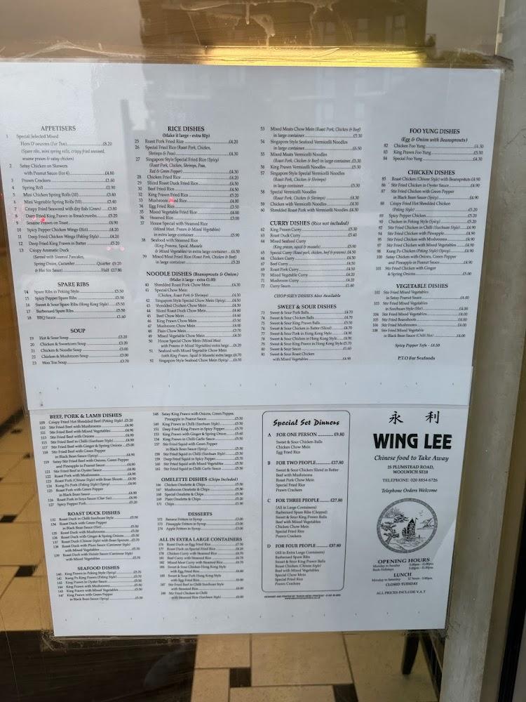 Located at 25 Plumstead Rd, London SE18 7BZ, Wing Lee thrives in the heart of East London. The restaurant’s central position makes it easily accessible, whether you’re grabbing a quick bite after work or settling in for a family dinner. It boasts a wheelchair-accessible entrance and seating, ensuring everyone enjoys a meal together.